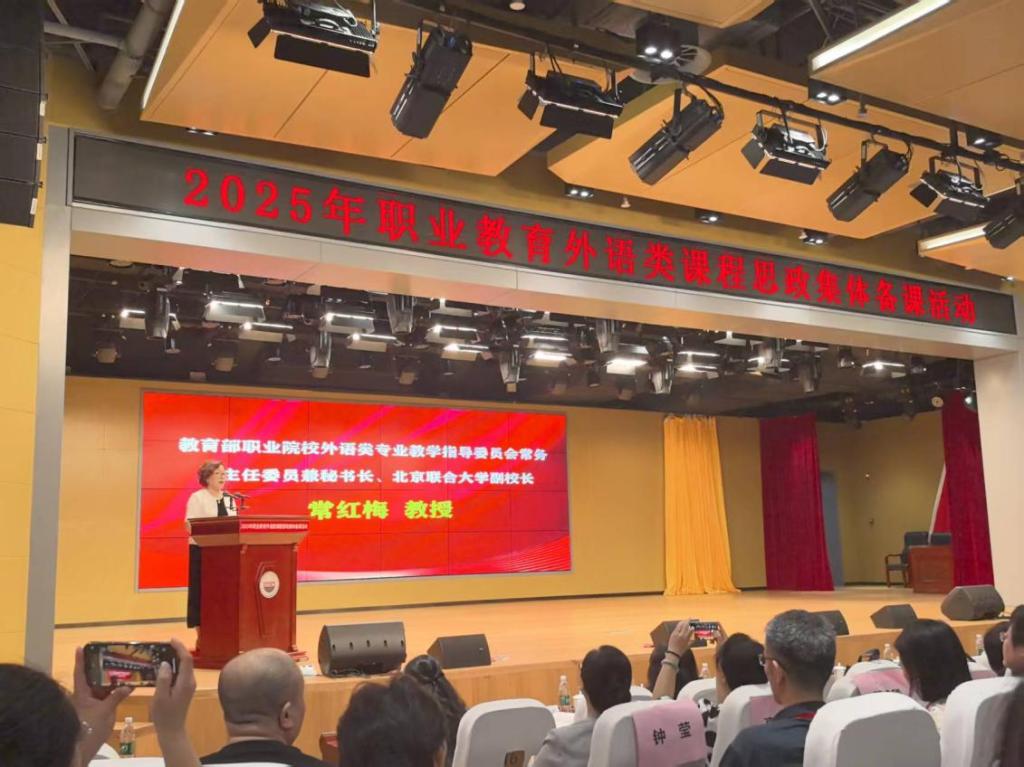 9月24日,教育部职业院校外语类专业教学指导委员会在北京举办“2025年职业教育外语类课程思政集体备课活动”。全国百余所职业院校的专家学者与骨干教师线上线下参加,共探外语课程思政建设新路径。教育部职业教育发展中心教学教材处副处长王艺雯,教育部职业院校外语类专业教学指导委员会常务副主任委员兼秘书长、北京联合大学副校长常红梅,北京经济管理职业学院党委副书记、院长田宏忠,外语教学与研究出版社党委副书记、副董事长、总编辑刘捷出席活动并致辞。我校外语商贸学院院长、教育部职业院校外语类专业教学指导委员会委员何少娴教授、学院教师韩静一同参会。