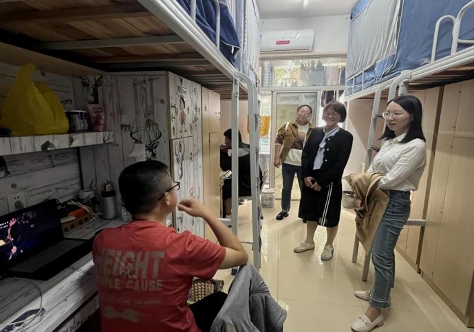 在走访过程中,郭晓莹与辅导员们认真查看了宿舍的卫生状况、安全设施以及整体环境。她叮嘱同学们应养成良好的生活习惯,共同维护整洁、清新的居住环境,并要求辅导员们持续关注,加强对学生的引导。同时,她格外关心来自外省学生的适应情况,详细询问了省外学生自入学以来的学习进度、饮食起居是否习惯以及生活中是否存在困难。她鼓励省外同学尽快融入新的集体生活,若遇到任何问题,要及时向辅导员和学院反映,学院将竭尽全力为大家解决困难。其亲切的话语使在场学生深感温暖。