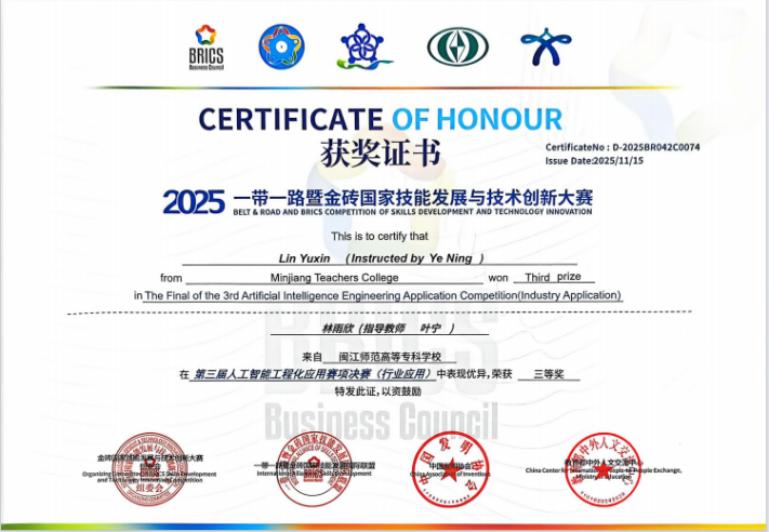 11月14日至16日,由金砖国家工商理事会中方理事会、“一带一路”暨金砖国家技能发展国际联盟等单位主办,武昌职业学院等单位联合承办的2025“一带一路”暨金砖国家技能发展与技术创新大赛之第三届人工智能工程化应用赛项(行业应用)决赛在武昌职业学院顺利收官。历经激烈角逐,我校物联网应用技术专业林雨欣同学(指导教师:叶宁)和陈艺祯同学(指导教师:叶宁)凭借扎实的技术功底,在工程实践环节发挥稳健,斩获两个三等奖。