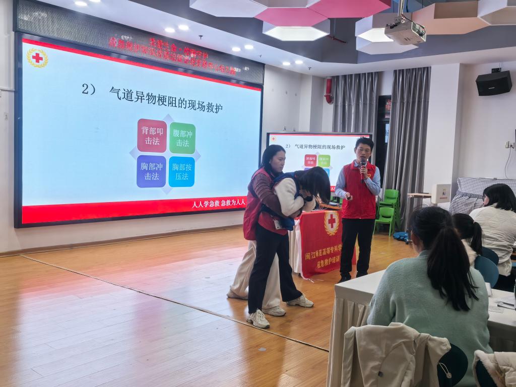 老师们结合PPT讲授、视频演示与现场模拟,系统介绍了心肺复苏术、AED使用方法,以及成人、婴幼儿气道异物梗阻的急救处理要领。参训人员在党员志愿者指导下分组进行演练,借助CPR模拟人、AED训练机等设备开展操作训练,并针对校园儿童常见急救场景进行了情景模拟,有效提升了参训人员的应急技能与实际应用能力。
