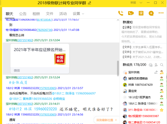 为做好2021年征兵及士官报名宣传工作,推进大学生应征入伍工作,帮助大学生了解、掌握直招士官相关政策和流程,充分激发大学生报名参军的热情,献身国防事业。4月5日至15日期间,计算机系分专业开展了多场线上宣讲会。