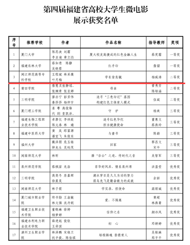 由杨威涛老师指导的微电影作品《学长翁良毓》荣获第四届福建省高校大学生微电影大赛二等奖。