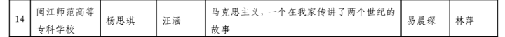 由林萍与易晨琛老师共同指导的作品《马克思主义,一个在我家传讲了两个世纪的故事》荣第四届福建省高校大学生主题征文和微演讲比赛优秀奖。