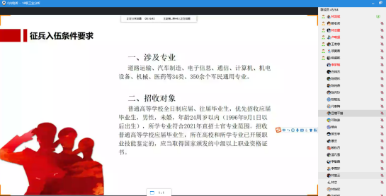 为做好2021届毕业生就业工作,拓宽应届毕业生就业渠道,帮助学生顺利就业,我系于2021年4月14日在线上组织开展“2021届毕业生招收士官宣讲会”。