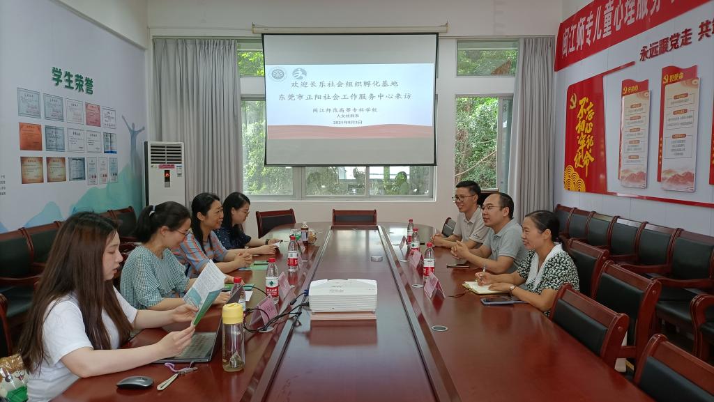 6月3日,长乐社会组织孵化基地项目负责人雷小辉、东莞市正阳社会工作服务中心总监刘华城、东莞市正阳社会工作服务中心行政总监夏彩云一行来我校参观并洽谈校社合作事宜,人文社科系副主任(主持工作)陈勤、社会工作专业老师余晶、张潇颖、叶佳媚热情接待了参访人员。