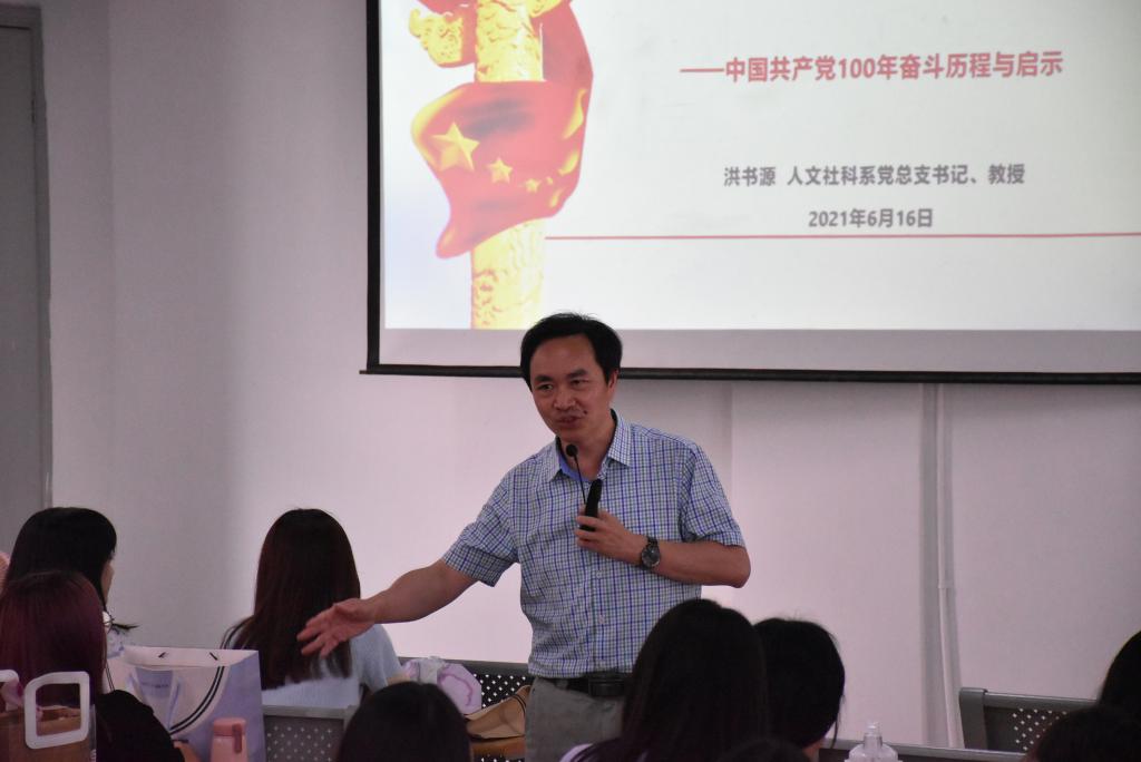 6月16日下午,人文社科系党总支书记洪书源在3#504教室为2019级心理咨询专业、文秘专业学生上了一堂题为《百年征程与党同行—中国共产党100年奋斗历程与启示》的形势与政策课。