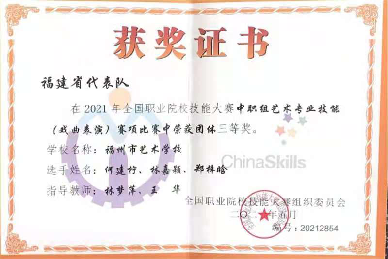 经过为期两个多月的专项训练,我校何建柠、林嘉颖和郑梓晗3名选手通过两轮剧目和唱、念、做、打环节比赛,取得了国赛团体三等奖。