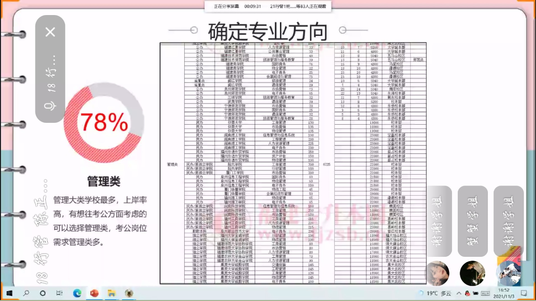 为培养大学生专业认同感,做好大学校园学习生活的自我定位,调动学生学习积极性,营造学校良好的学习氛围。人文社科系于2021年11月3日,以线上会议的形式举行第五届“人文心·青年说”大讲堂,此次活动由行政管理专业主办,管理教研室主任杨宁主持,特邀2018级行政管理专业优秀毕业生陈正鹏和张梓怡作为主讲嘉宾,共148名2021级新生在线同步参与。