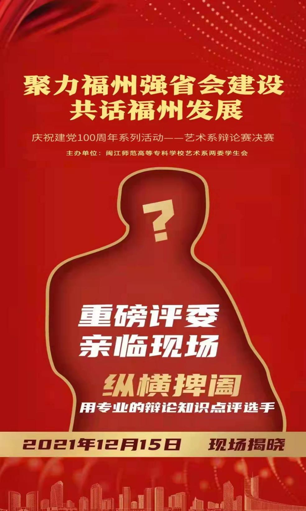 为深入学习贯彻党的十九届六中全会精神、省十一次党代会精神,进一步加强思想引领,宣传福州强省会战略,让更多的大学生了解福州城市发展,鼓励更多的学子留在福州就业创业,为大学城“六个一流”、福州市“六个城”建设贡献青春力量,艺术系于12月15日在旗山校区举办庆祝“聚力强省会建设,共话新福州发展”主题辩论赛。担任本次比赛评委的老师有:图书馆肖汀老师、初教系朱海莺老师、张一鸣老师、马克思主义学院林钊安老师、尹永江老师、学前系戴忠炜老师。艺术系团委书记周宇航、艺术系全体辅导员老师和学生代表参加本次活动。