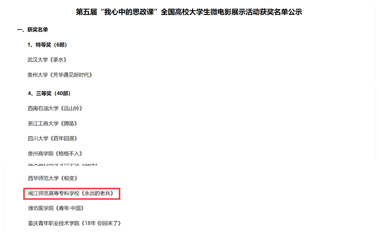 1月6日,由教育部高校思政课教学指导委员会主办的“我心中的思政课”第五届全国高校大学生微电影展示活动结果揭晓。我校教师洪书源、蔡玉榕共同指导的作品《永远的老兵》从全国参评的315部作品中脱颖而出,荣获三等奖,实现了我校在该赛项上的新突破。