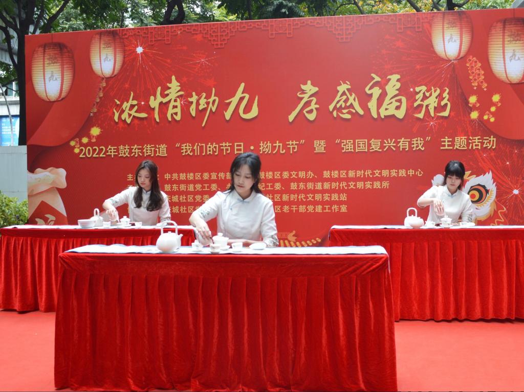 “一抹茉莉香,一品福州情”,学生志愿者还带来了茉莉花茶艺表演。一人一桌一椅一茶具,茶香宁静而致远,茶人淡泊而明志。茶香四溢,沁人心脾。给老人敬茶,通过拗九节活动表达敬老之情。