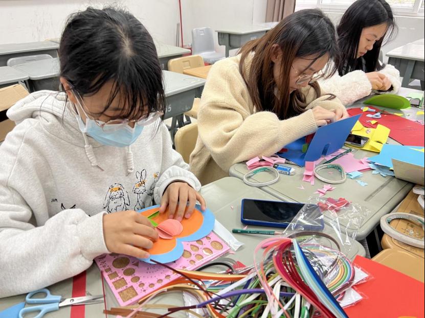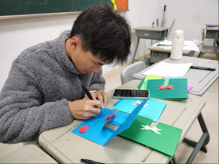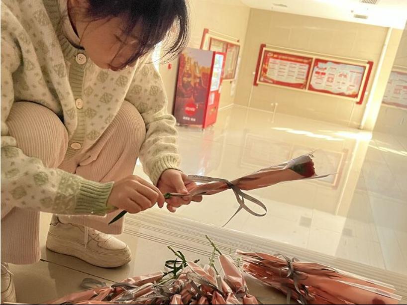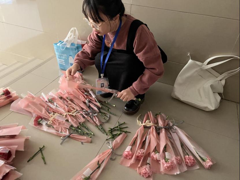 除了亲手制作的贺卡,同学们还提前预定了一批康乃馨,大家仔细裁剪鲜花梗的长度,仔细地装袋。这些经过同学们精心准备的特别礼物,代表着同学们最诚挚的祝愿。