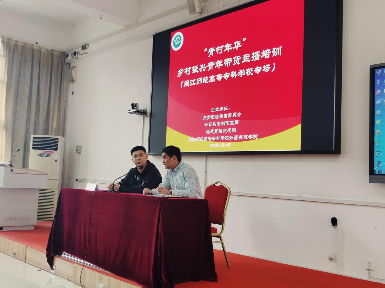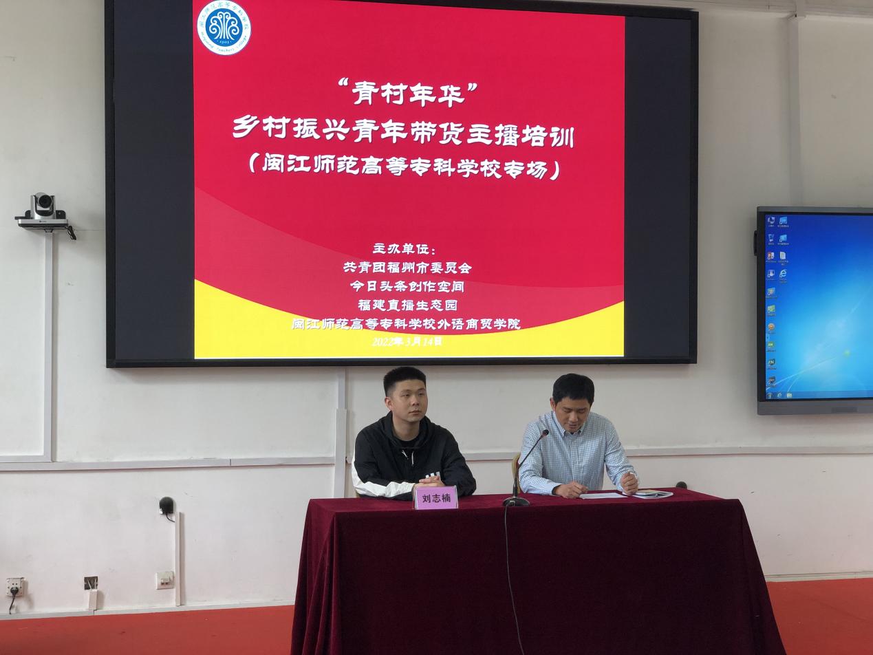为深入学习贯彻习近平总书记来闽考察重要讲话精神和总书记关于青年人才工作的重要论述,全面落实市委主要领导关于进一步培养福州本土乡村振兴带货主播有关指示和部署,助力福州乡村振兴事业建设,3月14日,外语商贸学院与共青团福州市委员会、今日头条创作空间、福建直播生态园联合举办“青村年华”乡村振兴青年带货主播培训闽江师范高等专科学校专场。培训邀请北大青创营导师、头条学堂认证讲师刘志楠为大家授课。外语商贸学院党总支副书记林冉、综合科科长刘诗雨出席本次活动,我校学生代表参加本次培训。