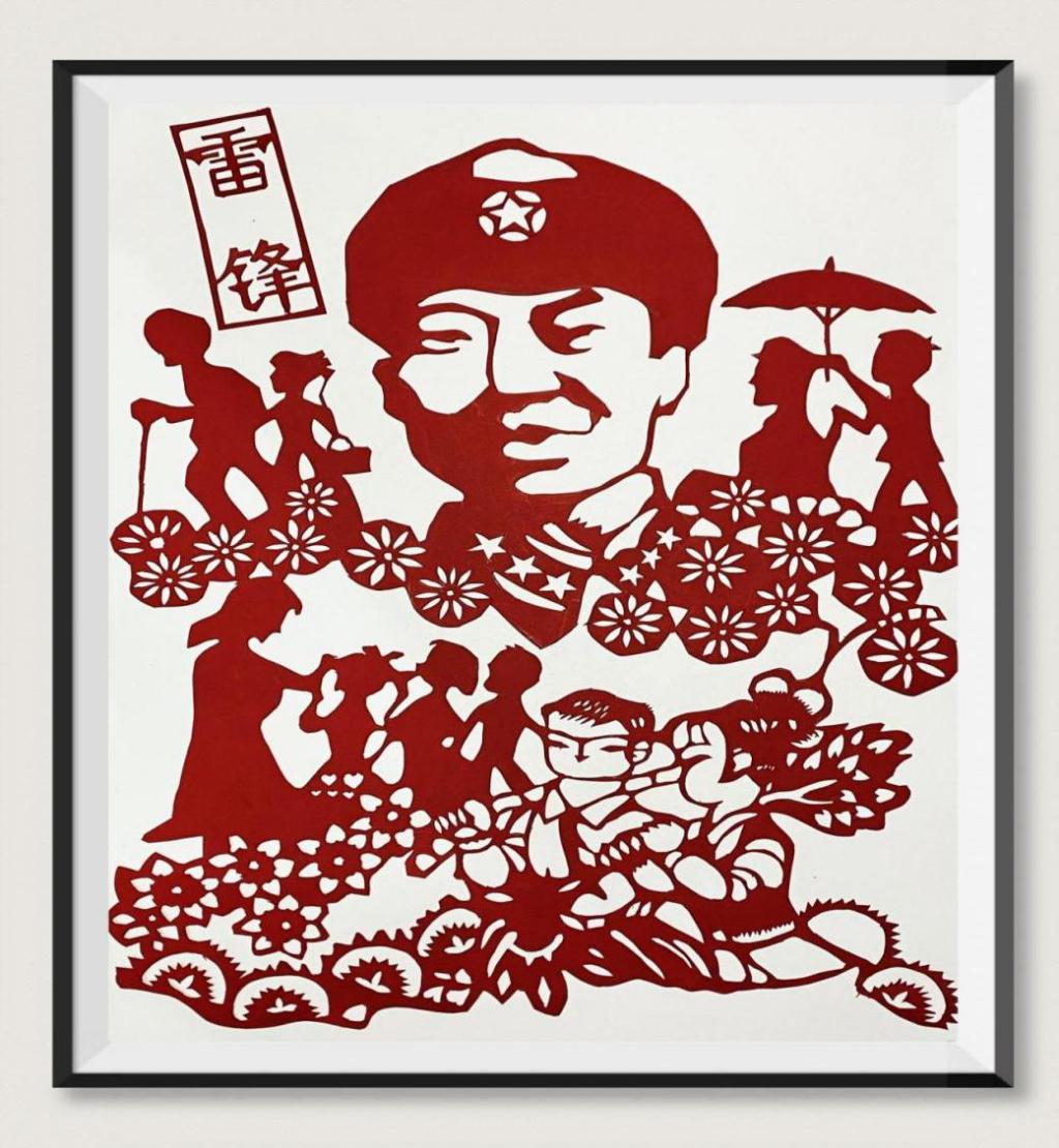 《奉献》是以雷锋精神来创作的作品,此次创作以红色调来呈现,运用了中国传统手工艺法剪纸来完成。