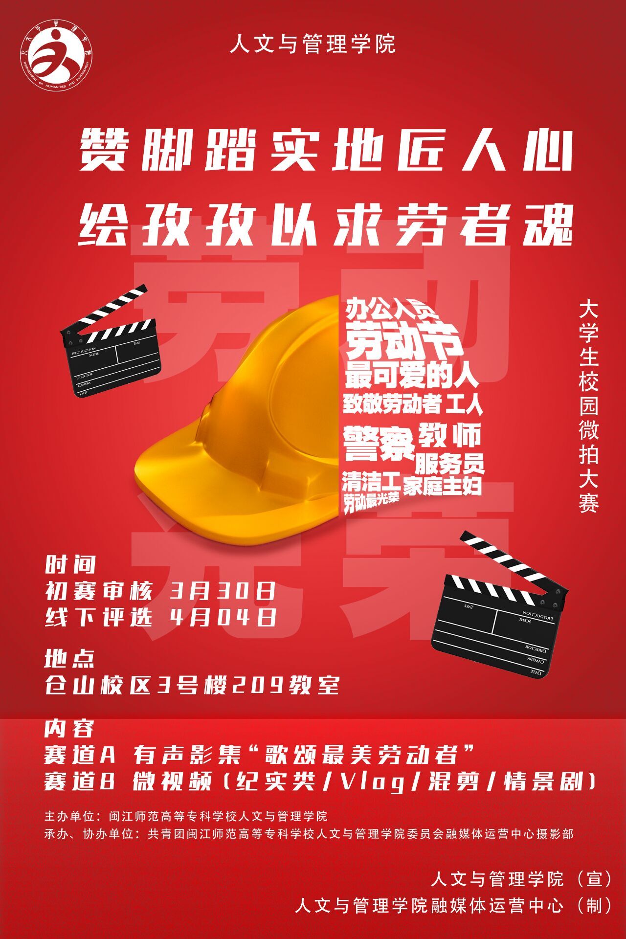 为全面提升学生的劳动素养,在劳动体验中获得健全的人格,以劳增智,以劳树德,以劳健体,让学生拥有幸福的生活能力。基于疫情防控要求,人文与管理学院于4月1日-4月8日在线上开展“赞脚踏实地匠人心,绘孜孜以求劳者魂”大学生微拍视频大赛活动。