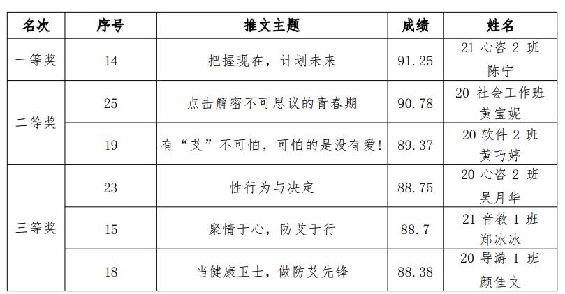 决赛评委由人文与管理学院4名辅导员、青春健康基地指导老师和19级同伴社社长担任,根据知识内容、主题特色、创作形式、创新意识等标准评阅微信作品,最终评出一等奖1名,二等奖2名,三等奖3名。