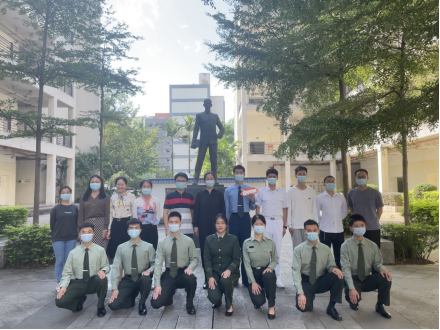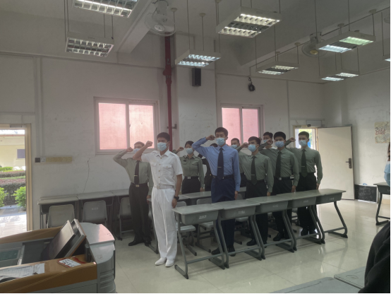 全体退伍士兵一同宣誓“退伍不褪色,我心终向党,坚定跟党走,争做新青年,树立好榜样,共建美好校园”。