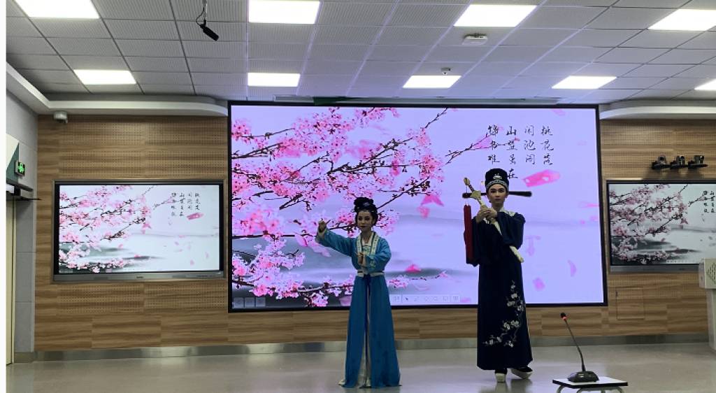 在经典古诗词沈园二首《声声慢》、《钗头凤》朗诵中,表演艺术专业的同学们展现了越剧身段元素,为朗诵作品增添了别样风采,展现我们对中华经典的传承与创新。