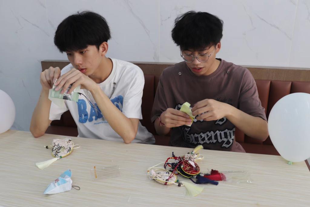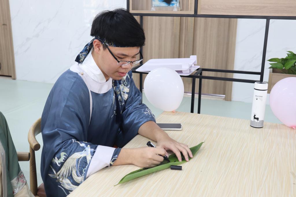 礼颂国风,端午呈祥。活动开始,同学们拿着马克笔,在粽叶上书写文字并绘制精美的图案,将“精心装扮”的一片片粽叶张贴到墙上,留下了对亲人好友的美好祝愿以及对未来的期许。不仅如此,更有热爱汉服的同学们穿上汉服,自信大方地表现着汉服的古典之美,一起穿越时空,演绎国潮服饰,共同感受传统文化的气息,渲染了活动现场的氛围。