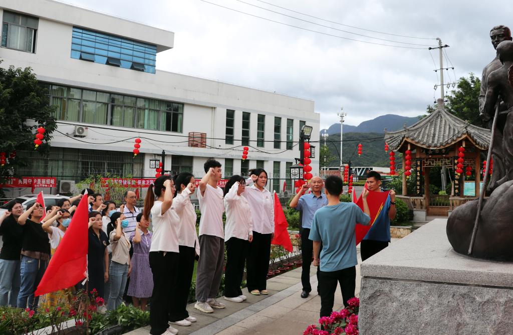 随后,党员们一起步入绍岐红色渡口党史展示馆,详细了解了革命时期绍岐渡工护送地下党过江的故事,重温了革命历史,接受了深刻的爱国主义教育。在绍岐横江渡口大型红色革命形象雕塑前,陈欣同志带领新吸收的5名预备党员入党宣誓和老党员重温入党誓词。面对鲜红的党旗,党员们举起右拳,郑重宣誓,铿锵有力的宣誓声回荡在活动现场。此外,纪检委员范玉婷同志还为全体党员上了一堂深动的廉政教育专题微党课。