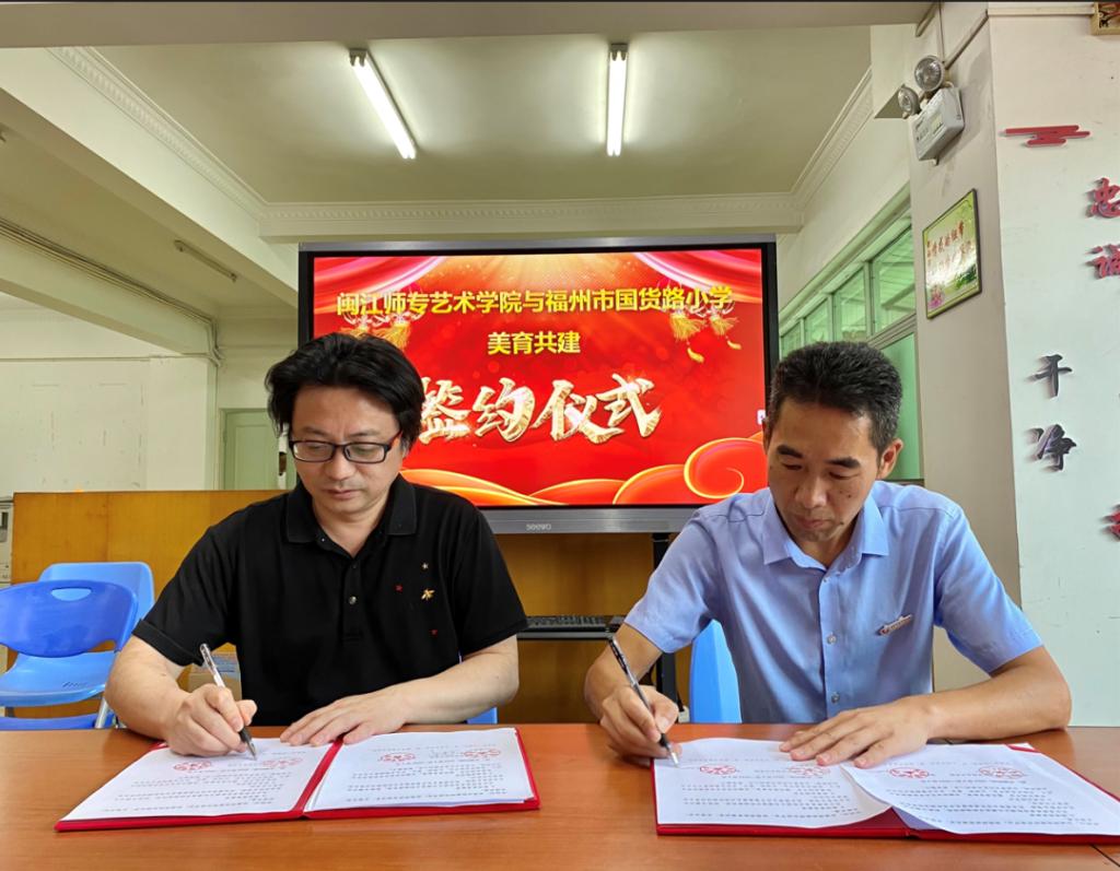 为深入贯彻落实习总书记关于教育的重要论述和全国教育大会精神,推进新时代学校美育改革发展,根据“教育部办公厅关于开展体育美育浸润行动计划的通知”(教体艺厅函(2019年)41号)、福建省教育厅组织实施体育美育浸润行动计划及福州市教育创建美育示范基地校等文件精神,按照“资源共享、优势互补、文明共建、协同发展“的原则,近日,闽江师专艺术学院(福州市艺术学校)与福州市国货路小学签订美育共建协议,结成共建单位。艺术学院院长、福州市艺术学校校长徐青,艺术学院副院长、福州市艺术学校副校长林理杰,学院相关教师、福州市国货路小学校长罗炳志及党政领导班子参加了本次仪式。