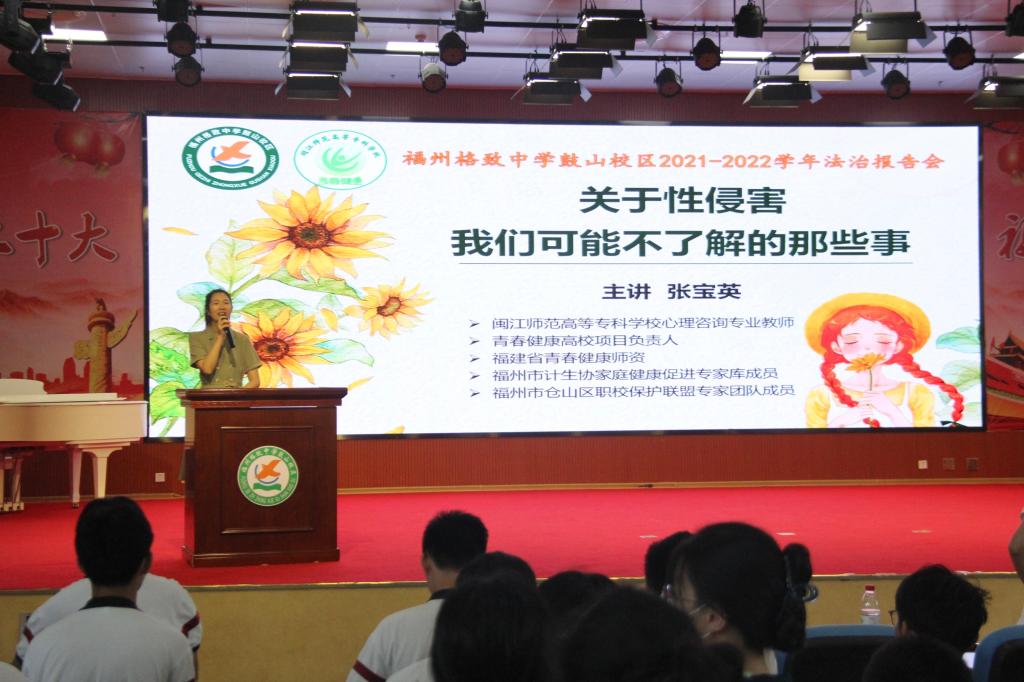 为进一步落实“青春健康”项目工作,丰富格致中学鼓山校区青春健康教育和青少年法治宣传教育,提高青少年的自我保护意识,创建和谐校园、平安校园,为同学们营造健康成长的良好氛围,7月15日上午,福州格致中学鼓山校区举行福州市计生协赠书仪式、2021-2022学年高中闭学式暨法治报告会。市计生协党组成员、副会长鲁大治,市计生协组织宣传处处长、四级调研员刘武,市计生协组织工作人员李桓,我校心理专业教师、福建省青春健康师资、福州市仓山区职校保护联盟专家团队成员张宝英受邀参加,福州格致中学鼓山校区书记、校长蒋铭生,副校长钱玮韡,校青春健康俱乐部负责人刘莹颖、李丽玉等出席,校德育处成员及高一、高二年段全体师生参加本次活动。