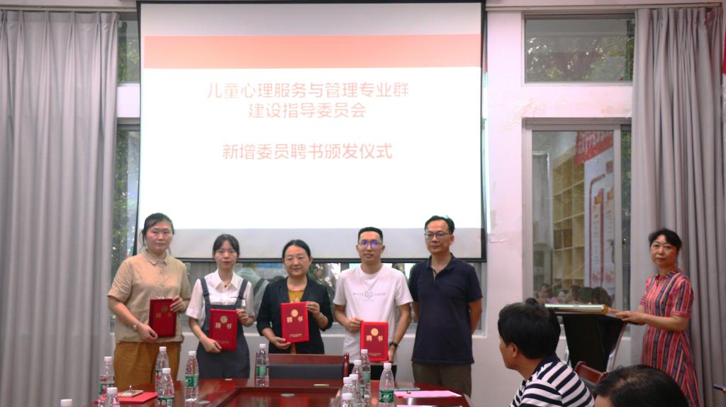 儿童心理服务与管理专业群负责人、人文与管理学院副院长刘少艾汇报了2021-2022年度专业群的建设成效。陈强向新增委员颁发聘书,聘任连榕担任专业群主任委员,聘任福州大学赵陵波教授等五位行企业专家为委员。