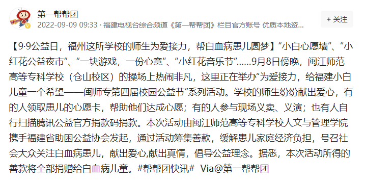 据悉,通过校园公益节的开展,让公益理念更加深入人心,进一步营造助人为乐、关心公益事业的校园氛围,同时号召社会大众关注小白儿童,献出爱心、献出真情,伸之援手,以小爱铸就大爱,为公益事业添砖加瓦。截止9月9日,活动共筹款4234.4元,完成小白儿童心愿80个,福建媒体第一帮帮团走进校园报道了此次活动。