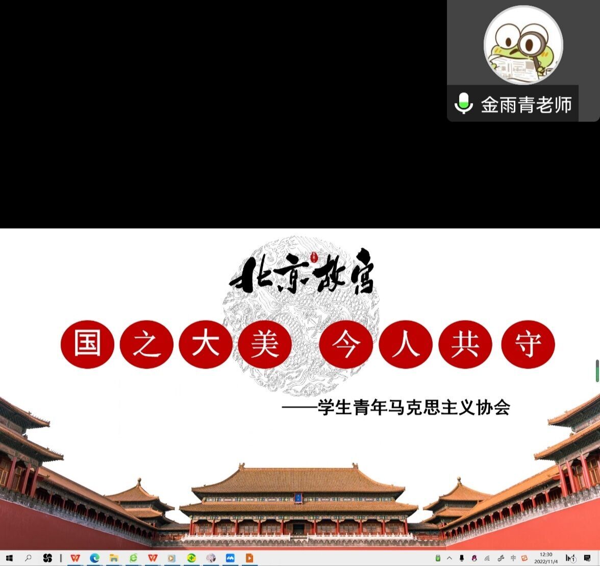 11月18日,马克思主义学院青年马克思主义协会(读书社)面向全校学生举办“国之大美,今人共守”线上实践活动,以“AR+实践”模式,带领同学们云游故宫,沉浸式感受中华民族瑰宝之美。活动由学院教师金雨青主持,300多名同学积极响应,积极参与。