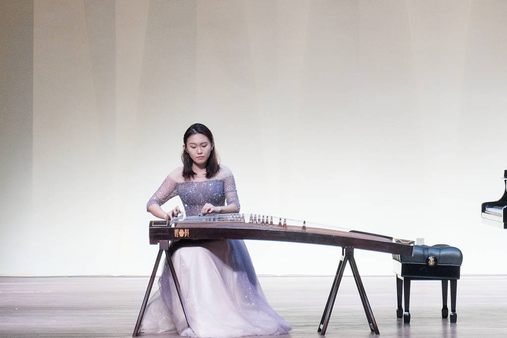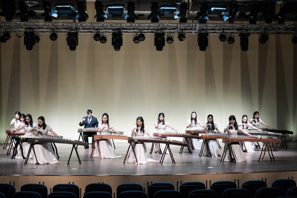 下半场器乐专场,管乐合奏《没有共产党就没有新中国》和长笛重奏《游击队之歌》,两首红色经典乐曲再次掀起音乐会的高潮;筝乐团重奏《瑶族舞曲》、古筝演奏《西部主题畅想曲》《行者》以抒情优美的旋律,粗犷强烈的节奏,描绘出少数民族的人文风情;《中国畅想曲第二号—舞曲》《哈尼情歌》《平湖秋月》《花鼓春吟》《森林的呼啸》《激流》《d小调奏鸣曲》等作品,学生流畅的演奏将浓郁的民族色彩、人与自然、对“福”文化和美好社会的向往完美呈现;钢琴独奏作品《皮黄》将传统京剧和钢琴艺术进行了完美整合,展现出独具魅力的意韵。器乐演奏专场上学生专业演奏技能的演绎,让民族乐器与西洋乐器的美妙乐声久久回荡在音乐厅。