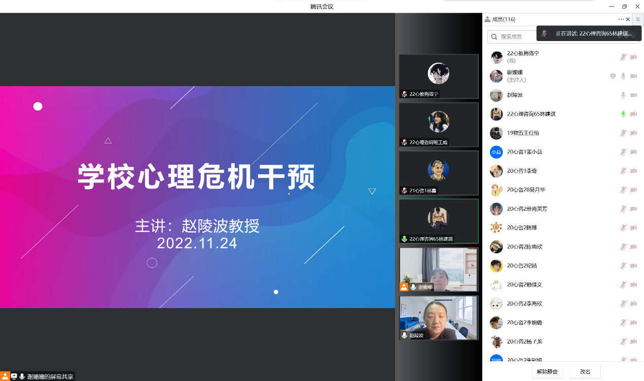为了切实推进学校心理健康教育工作,提升广大师生身心健康水平、发展师生心理危机事件的干预和预防能力、促进学生身心健康发展。11月24日,人文与管理学院邀请了福州大学人文学院应用心理学系赵陵波教授,面向学院全体辅导员、心理健康中心、心理专业师生开展心理危机干预专题讲座。