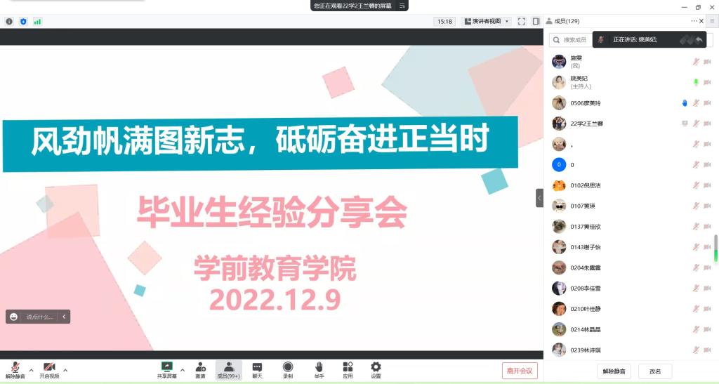为引导同学们认清当前就业形势,树立积极就业观,提升就业能力,学前教育学院于12月9日在线上召开“风劲帆满图新志,砥砺奋进正当时”毕业生就业经验分享会。本次分享会邀请了任雨萱、林屿洁、刘陈成、张雨欣、蒋亚玲等五位2022届学前教育专业毕业生。本次会议由学院姚美妃老师主持,毕业班辅导员及2023届毕业生参加了此次分享会。