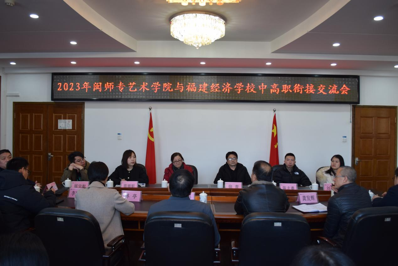 为贯彻落实《国家职业教育改革实施方案》,深入推进“3+2”联合办学工作,促进学院高质量发展,2月16日下午,艺术学院院长徐青率队前往福建经济学校参加2023年闽师专艺术学院与福建经济学校中高职衔接交流会。福建经济学校党委书记郑长青、校长罗德兴、党委委员、副校长王养生,以及招生就业办、艺术专业系部相关教师出席了交流会。