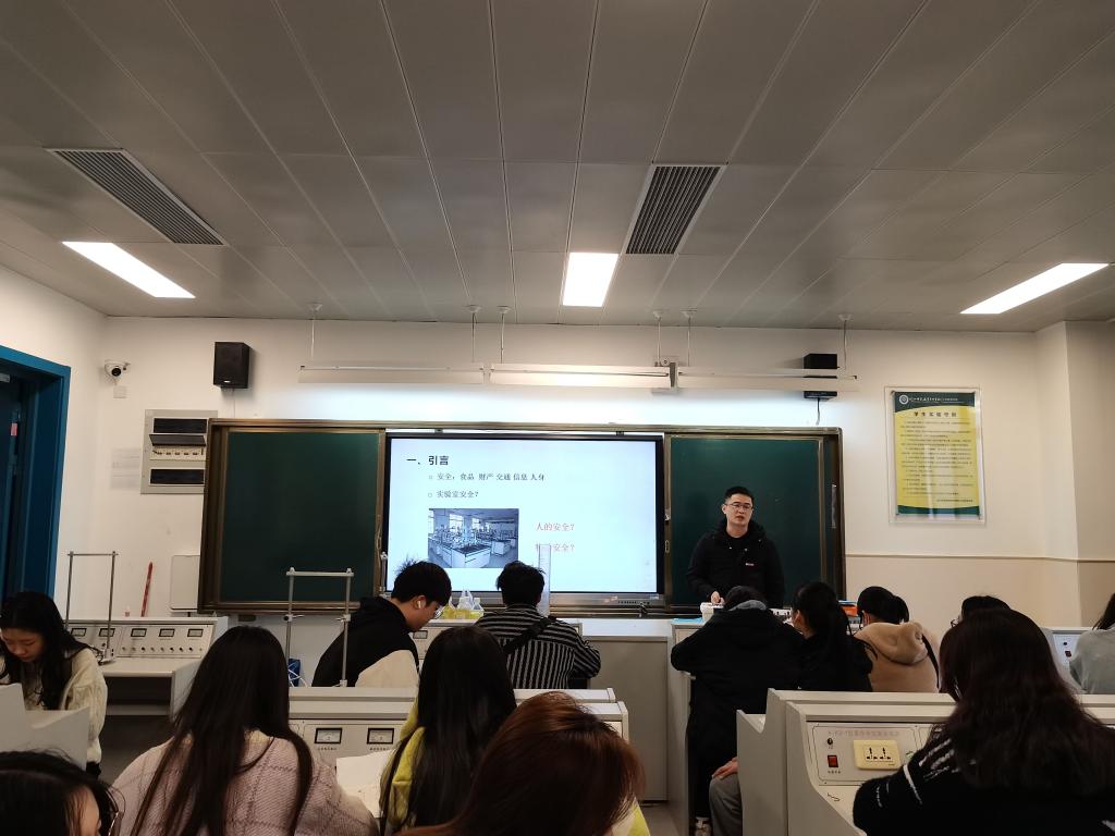 在物理实验室内,邹明忠向各位同学们介绍实验室中的主要危害因素,如何正确规范使用物理器材,普及实验室安全教育。邹明忠以展示历年实验严重安全事故的新闻和图片的方式,让同学们深刻认识到实验室安全的重要性。每一位同学们都聚精会神地听讲,认真思考着一些实验室可能存在的安全隐患。