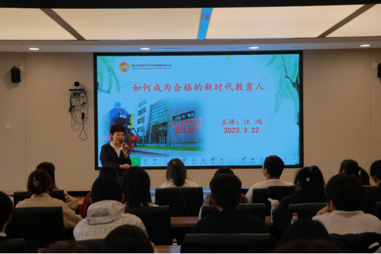 讲座中,江鸿从“时代背景”、“附小样态”、“成长建议”三个方面展开,结合党的二十大精神,介绍了我国科教兴国战略、“四个深刻认识”等教育工作的发展契机,从浅入深地讲解新时代教师需要具备的核心素养、关键能力,强调作为教育工作者,应该与时俱进,同时坚守教育本真和初心,勇担培育祖国未来的使命。江鸿结合自己从事小学教育工作几十年来的实践经历,用幽默风趣又亲切感人的语言,丰富生动的真实案例,为我校师生诠释了“如何成为一名新时代的教育人”。