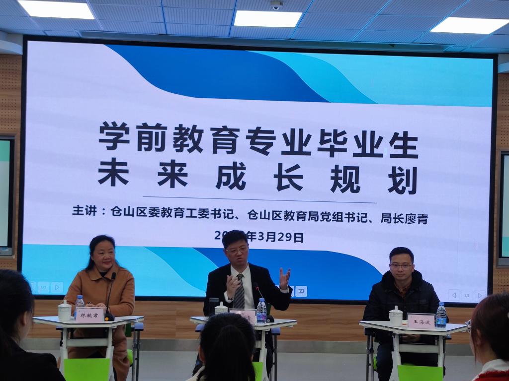 3月29日上午,仓山区委教育工委书记、区教育局党组书记、局长廖青来校开展学前教育专业毕业生未来成长规划座谈交流会。学前教育学院党政班子成员、师生代表参加活动。活动由学前教育学院院长林毓君主持。