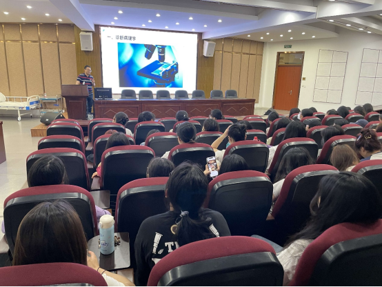 “病理诊断及临床病理检测技术”主题讲座中,杨清海从基础病理技术——组织脱水、固定、染色、切片、封片,到病理理论知识、诊断要点、鉴别诊断等方面,向同学们深入浅出地讲解诊断病理学、免疫组织化学、荧光原位杂交等技术及其应用。