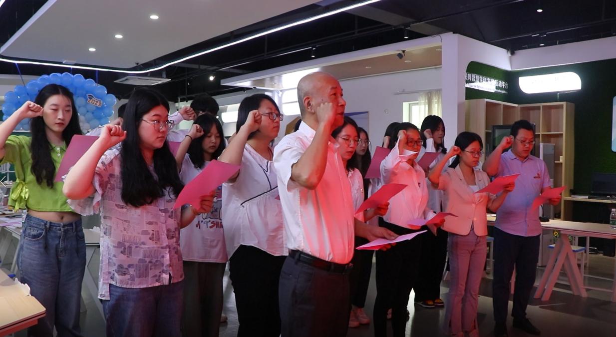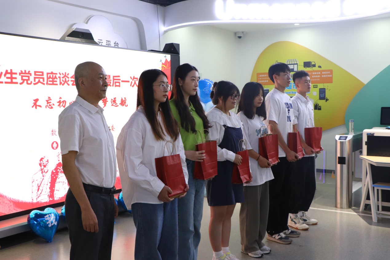 离校临别之际,与会师生党员重温入党誓词,激励师生党员不忘初心,牢记使命,接续奋斗。陈欣还一一为毕业生党员赠送了毕业“行囊”,一枚党徽、一本《中国共产党章程》、一本红书,送上沉甸甸的“行囊”为毕业生党员“壮行”。