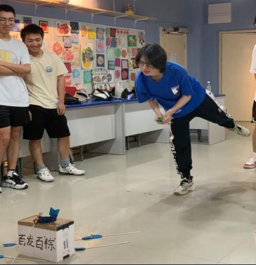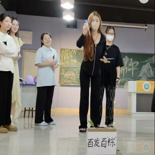 活动包含祈愿步福途、“粽”话反说、百发百“粽”等环节,同学们将一张张写满节日祝福的便签条粘贴在祝福墙上,愿美好都接“粽”而来;小小“粽子”脸上妆,在脸上手绘出不同风格的粽子,感受到中国传统节日的独特魅力;同学们“奋笔疾书”挑战端午知识竞答;从易到难的“‘粽’话反说”挑战自己的逆行思维;百发百“粽”感受经典传统的端午投壶游戏。现场活跃欢快的气氛让同学们真切感受到了家的温暖和浓厚的节日氛围。