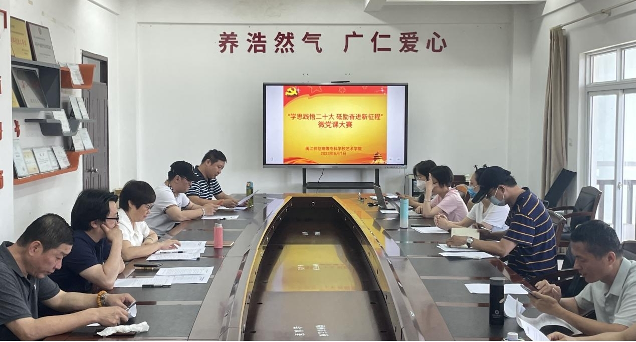为推动习近平新时代中国特色社会主义思想入脑入心,营造学习贯彻党的二十大精神的浓厚氛围,6月1日上午,艺术学院于甘蔗校区4楼会议室开展以“学思践悟二十大 砥励奋进新征程”为主题的微党课比赛,比赛由党委组织委员林理杰主持,党政联席会成员、部分党员代表参加。