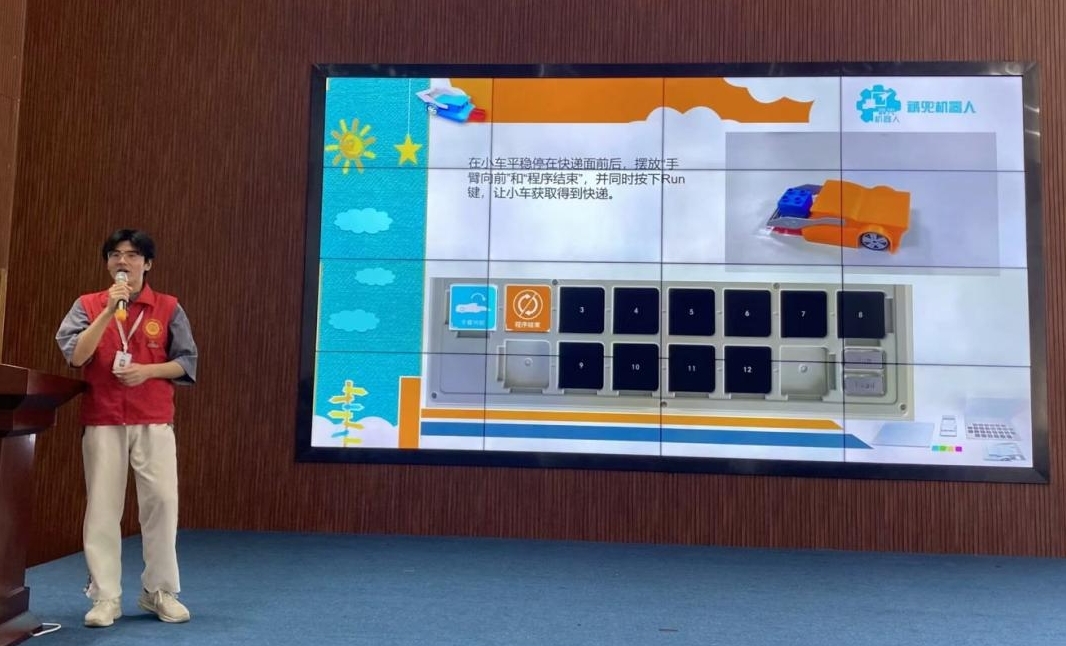 开班式结束后,学院学生志愿者讲授了《裤兜机器人》课程第一课。课堂上,“小老师”们全情投入教学,小朋友们专心致志,氛围活跃。通过趣味编程游戏和动手实践,给社区小朋友们带来了一场趣味横生的编程体验。