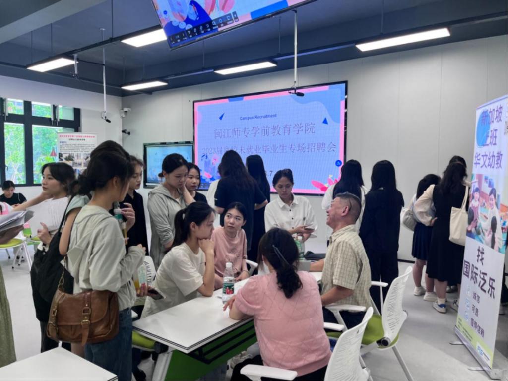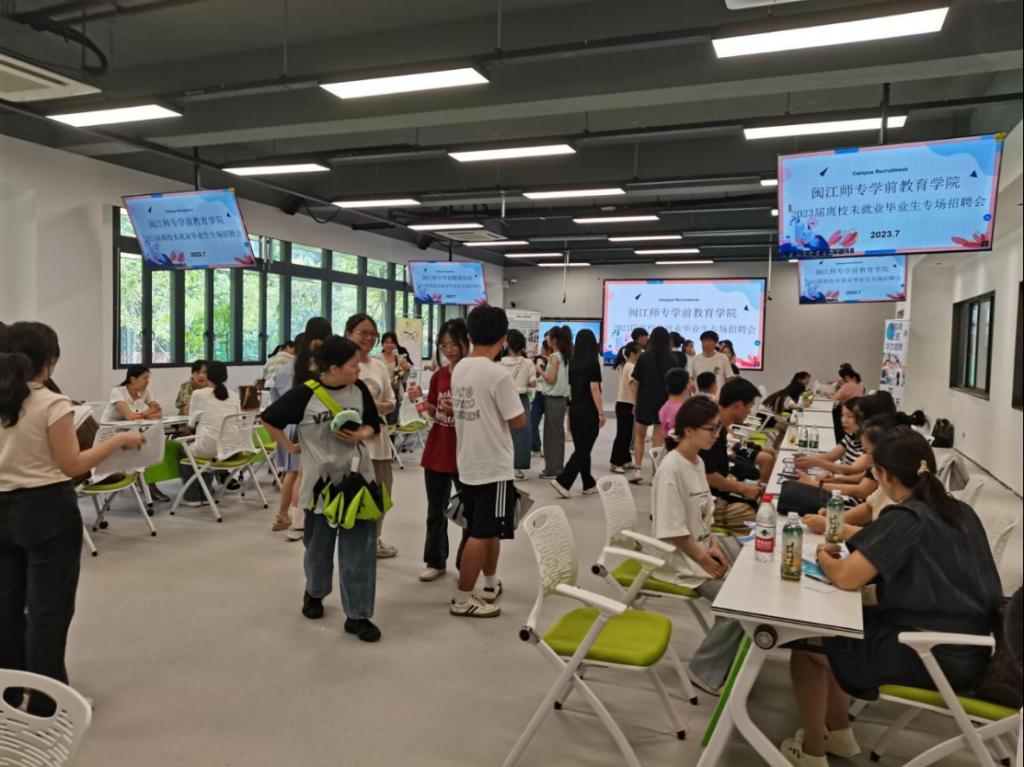 根据2023届离校未就业毕业生需求,本次招聘会邀请了仓山国投教育集团、晋安区实验幼儿园、晋安区第二实验幼儿园、福州高新区海峡幼儿园第一园、晋安区第三实幼西园分部、闽江师范高等专科学校附属实验幼儿园、贝芽智能科技有限公司、福州市仓山区吾童乐教语训康复中心、福州新同学教育科技有限公司、长乐区鹤上镇童心幼儿园等多家幼儿园和培训机构,为毕业生提供充足的工作岗位。为了让毕业生们更好地了解招聘信息,毕业班辅导员不仅组织了校园招聘动员会,还提前将企业招聘目录推送给学生,方便学生根据需求到现场进行精准求职。招聘会上,各用人单位不仅悉心解答毕业生有关岗位要求、薪资待遇、发展前景等内容,还组织现场片段教学等实战考核,直接现场签订劳动合同。