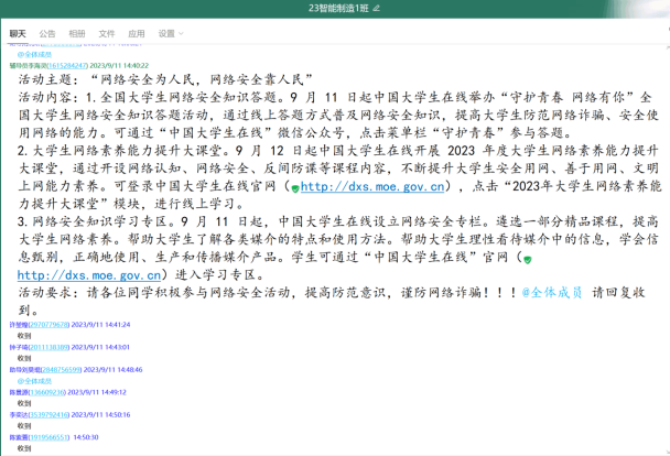 李海灵通过线上宣传的方式,在QQ群宣传网络安全相关知识,号召新生们积极参与大学生网络安全知识答题、大学生网络素养能力提升大课堂等活动,提醒同学们防范网络诈骗,警惕网络安全,保障自身安全。