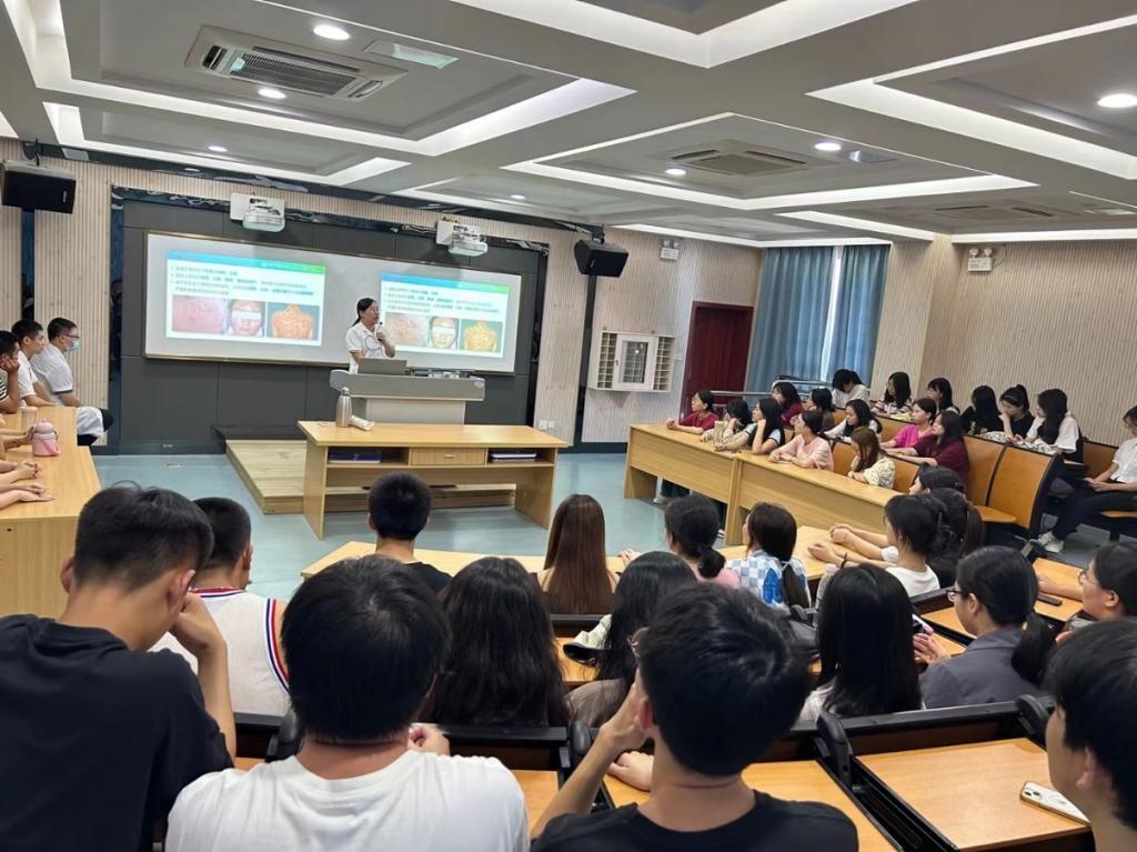 同时,在新实验楼五层示教室,福清市医院皮肤科主治医师同学们讲解了青春痘的因果及痤疮的精准治疗,旨在普及大学生群体痤疮治疗的医学常识,帮助患者解决痤疮困扰,早期干预,积极正规治疗,减少后遗症的发生。现场80多名学生也是热情高涨,踊跃发言提问,受益匪浅。
