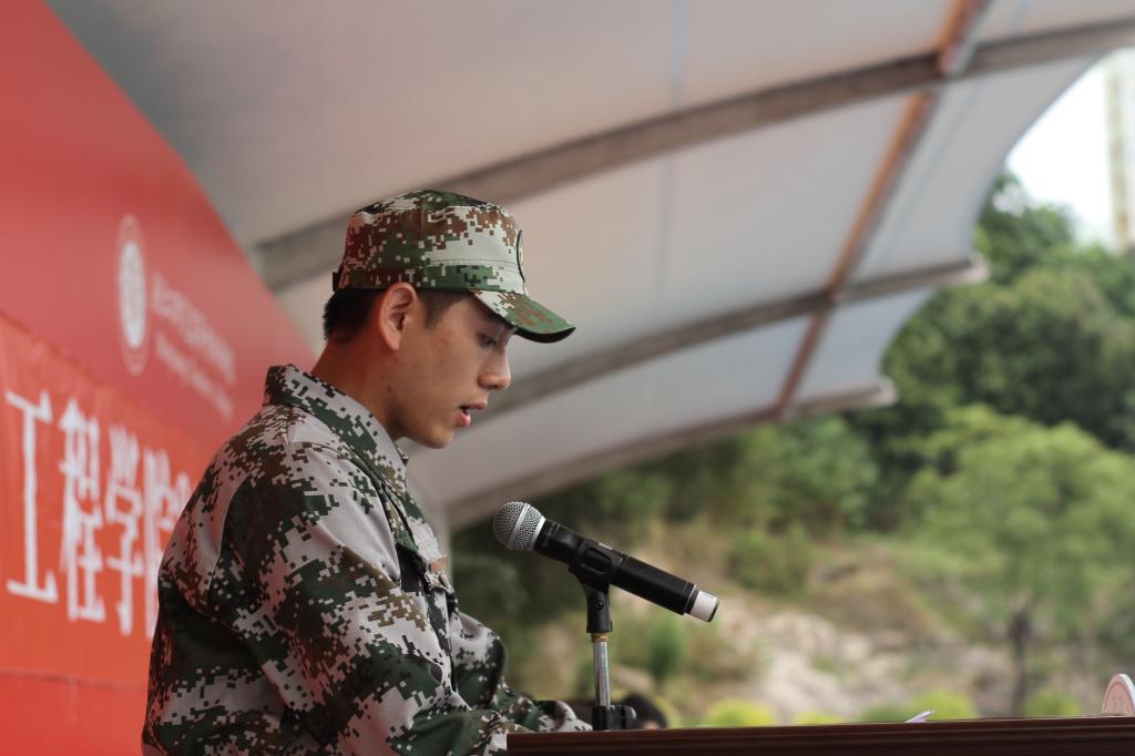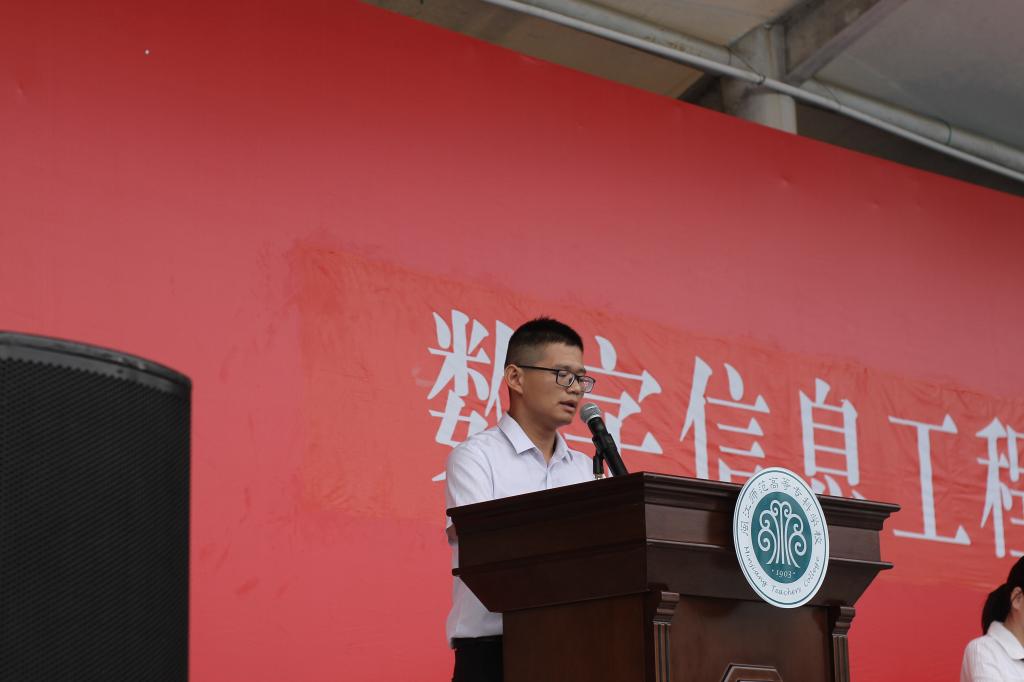 教师代表戴建成,以幽默风趣、轻松活泼的开场,介绍了自己担任三年辅导员的工作经历,寄语新同学们要做一个有道德、有目标、能持之以恒、能正面面对挫折的人!他希望青年学生通过自身的拼搏与努力,成为一个优秀的学子,成为一个职场精英,给自己一个美好的未来。
