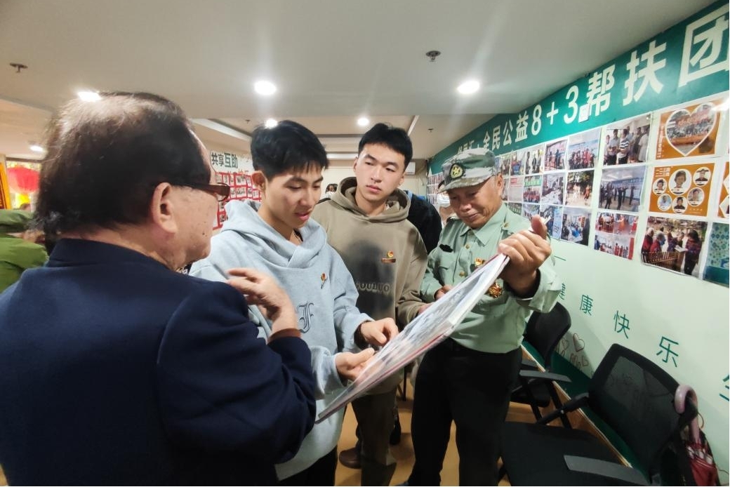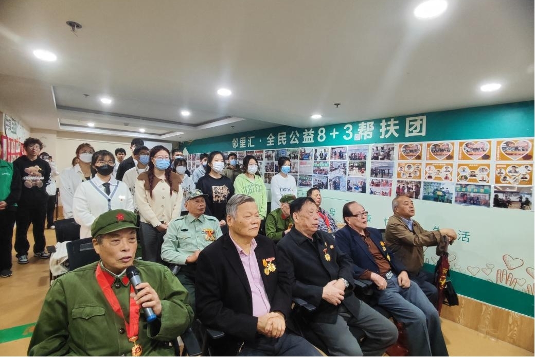 初到社区,青年志愿者就为老兵们送上温暖的问候,献上鲜花,表达敬意,与老兵们拉家常,并对社区进行清扫。参加过抗美援朝战争的老兵们为同学们介绍了社区内红色历史文化照片墙,分享他们的人生经历。同学们深切地感受到革命的艰苦卓绝与先辈们英勇伟大的牺牲奉献精神。志愿者还与老兵们一起唱红歌,一同感受往昔峥嵘岁月。