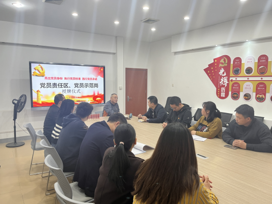 党总支副书记吕志达介绍了党员责任区、党员示范岗创建要求、划区职责、上岗目标和人员分布,希望责任区党员聚焦工作要求、示范岗党员着力示范引领,要有位有责、有岗有为,要精进业务、精细服务,要联结协作、联动带动,营造“一个责任区一个堡垒、一个示范岗一面旗帜”的良好氛围。