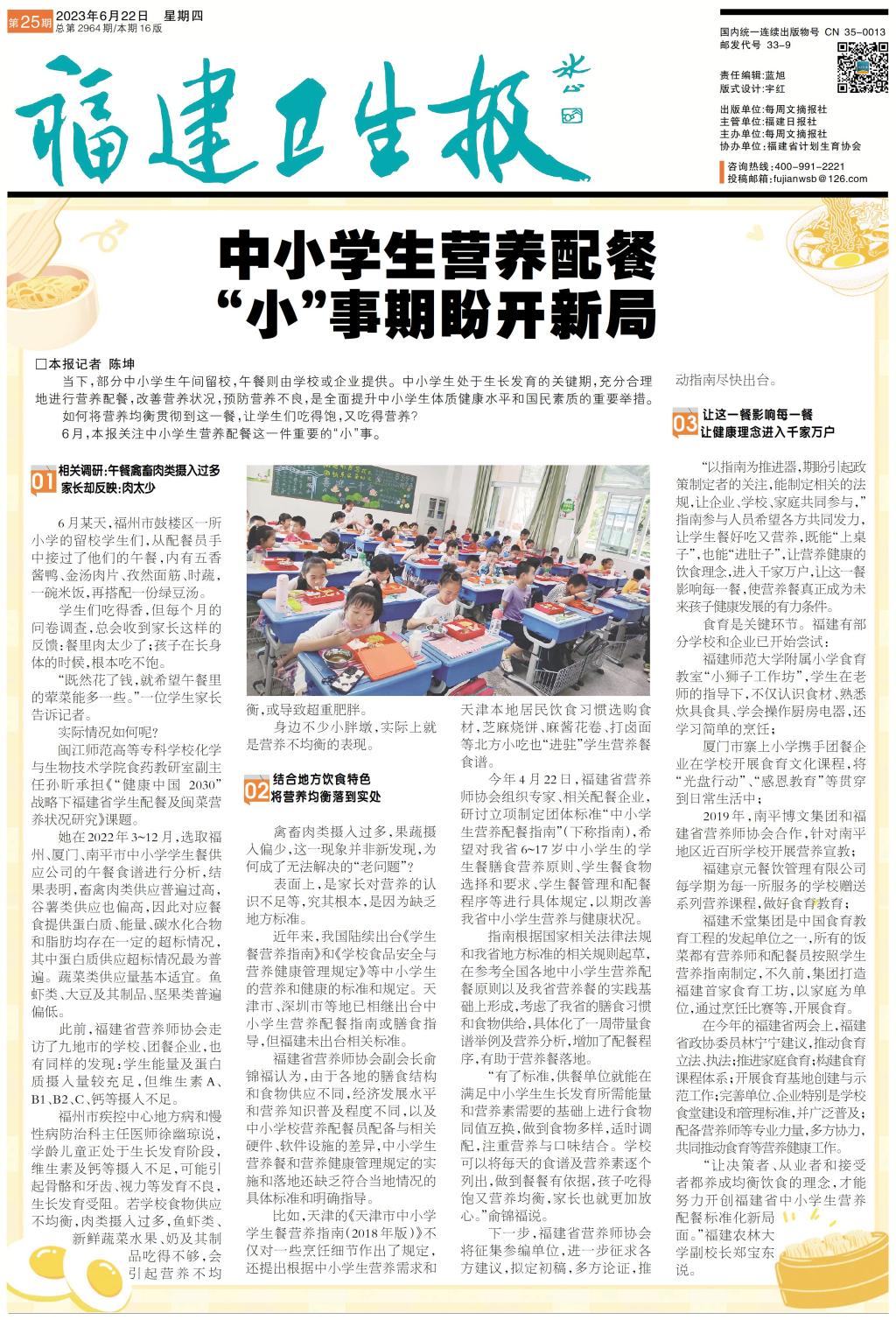 《福建卫生报》(2023年06月22日第25期 第16版)对化学与生物技术学院食药教研室副主任孙昕研究的课题成果进行引用报道。孙昕在课题——“健康中国2030”战略下福建省学生配餐及闽菜营养状况研究中,对福建省多地中小学午餐食谱进行详细调研和科学分析,为全面提升中小学生体质健康水平和改善国民身体素质工程的开展提供理论依据。
