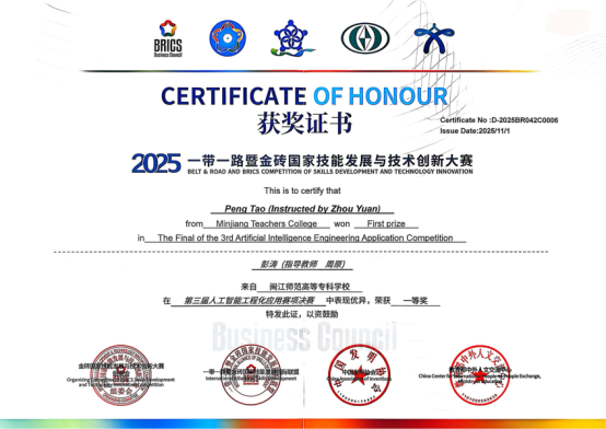 10月31日至11月2日,2025“一带一路”暨金砖国家技能发展与技术创新大赛之第三届人工智能工程化应用赛项(工程实践)决赛在漳州职业技术学院成功举办。经过激烈角逐,我校物联网应用技术专业学生表现突出,斩获个人一等奖1项、三等奖1项的优异成绩。其中,彭涛同学(指导教师:周原)凭借扎实的技术功底与创新应用能力荣获一等奖;林腾峰同学(指导教师:尹小俊)在工程实践环节中稳定发挥,荣获三等奖。