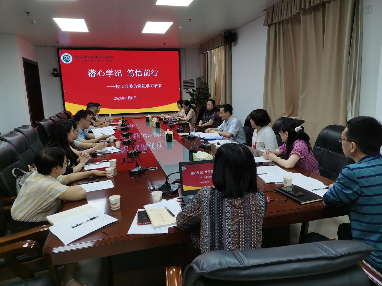 5月8日下午,校工会组织全体“三委”委员在旗山校区综合楼九楼会议室召开党纪学习教育集中学习会。校党委副书记、工会主席林旻、副校长谢敏峰参加会议。